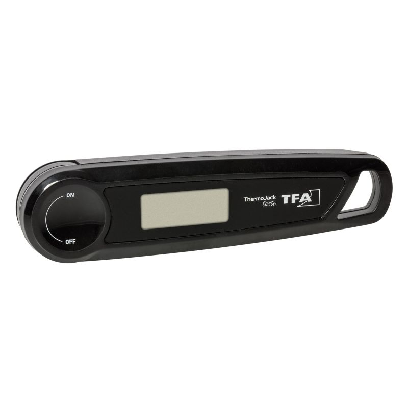 So that your next barbecue with guests or family is a complete success, get the THERMO JACK TASTE as a reliable aid when grilling and cooking. With this practical thermometer, you know exactly when your meat, fish or poultry has reached the ideal temperature – guaranteeing you a perfect taste experience that really hits the spot. But that's not all: Whether you're preparing baby food or serving drinks, the THERMO JACK TASTE is always ready when you need the right temperature in your kitchen. Simply open the device, insert its stainless-steel probe (101 mm long) into your food and, after just a few seconds, the display will show the exact core temperature – accurate to one decimal place. After use, you can easily clean the thermometer under running water. Its practical folding design makes it easy to switch off and stow away. If you don't need the thermometer at the moment, you can also hang it up on your kitchen rail so that you always have it ready to hand for when you need to use it next. The THERMO JACK TASTE is powered by a 1.5V AAA battery. This standard battery is not included in the scope of delivery.