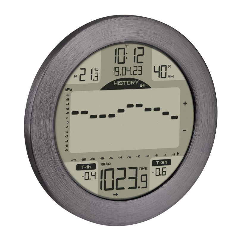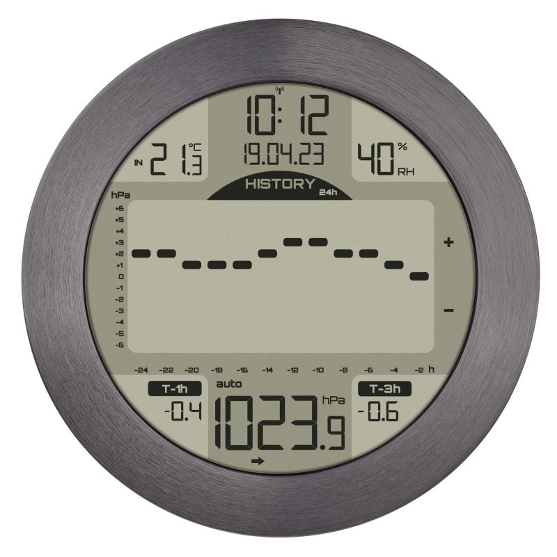 - Permanent display of the atmospheric pressure difference of the last 3 hours (in hPa) with 4 adjustable alarm limits